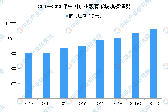 职业教育由于专业针对性强,就业率水平整体较高。职业教育是技术技能人才的摇篮。加快发展职业教育,既是填补当前人才短板之所需,又能为未来产业发展夯实基础。在新一轮科技革命和产业变革的机遇面前,职业教育大有可为,也应大有作为。2013年职业教育市场规模为6016亿元,2017年增至7681亿元,预计于2022年将突破10000亿元。